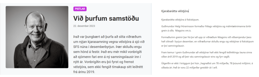 Fram kemur í grein Guðmundar að vélstjórar hafi ekki fengið leiðréttingu launa sinna síðan árið 2019 og að þeir séu samningslausir, eins og fyrr sagði.