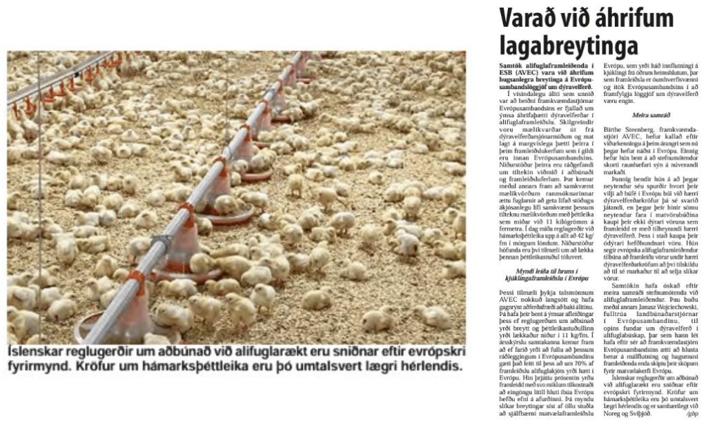 Komnar eru fram hugmyndir í Evrópusambandinu um að heimila ekki framleiðslu á kjúkingakjöti nema sem svarar til 11 kg af kjöti á hvern fermetra í eldishúsi, eftir því sem segir í Bændablaðinu og sjá má hér að ofan. Verði þetta niðurstaðan mun Ísland nánast örugglega apa reglugerðina eftir og trúlegast á þann veg, að hér á landi verði ekki leyfður meiri þéttleiki í húsum en sem svarar til 8 til 9 kílóa á fermetra. Verði niðurstaðan þessi, er framleiðslunni sjálfhætt, bæði hérlendis og í ESB. Þess í stað verður flutt inn kjöt frá öðrum löndum, löndum sem við viljum helst ekki taka okkur til fyrirmyndar.