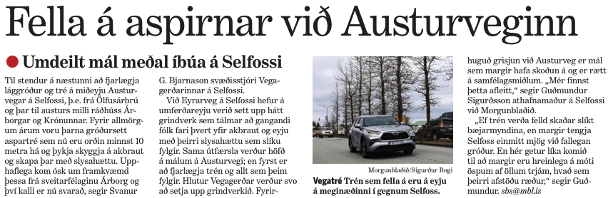Fréttin birtist í Morgunblaðinu fyrir nokkru og varð til þess að það rifjaðist upp fyrir ritara hve ánægður hann varð, að sjá það sem verið var að gera á Selfossi til fegrunar bæjarins, þegar trén voru gróðursett.