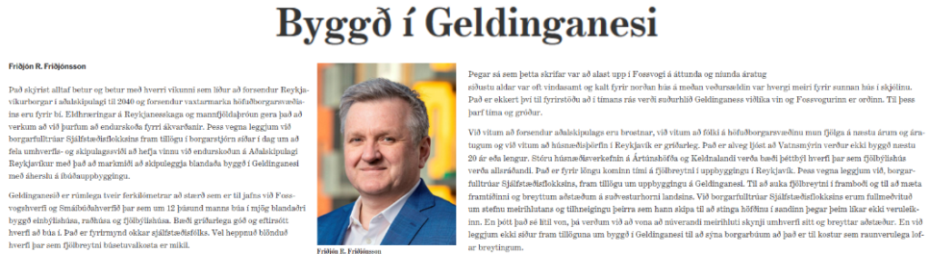 Borgarfulltrúi Sjálfstæðisflokksins bendir á í aðsendri grein í Morgunblaðinu að þörf á að endurskoða hugmyndir um byggð á höfuðborgarsvæðinu og að betra geti verið að byggja frekar upp á Geldinganesi, þar sem um sé að ræða tveggja ferkílómetra byggingarland.