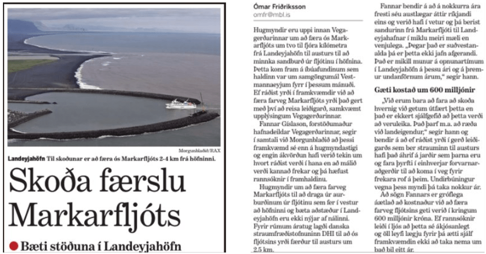 Og vegna þess að sandurinn berst til vesturs, þá vilja menn færa fljótið til austurs, því þá getur sandurinn borist til vesturs og í höfnina, en er dálítið lengur á leiðinni.