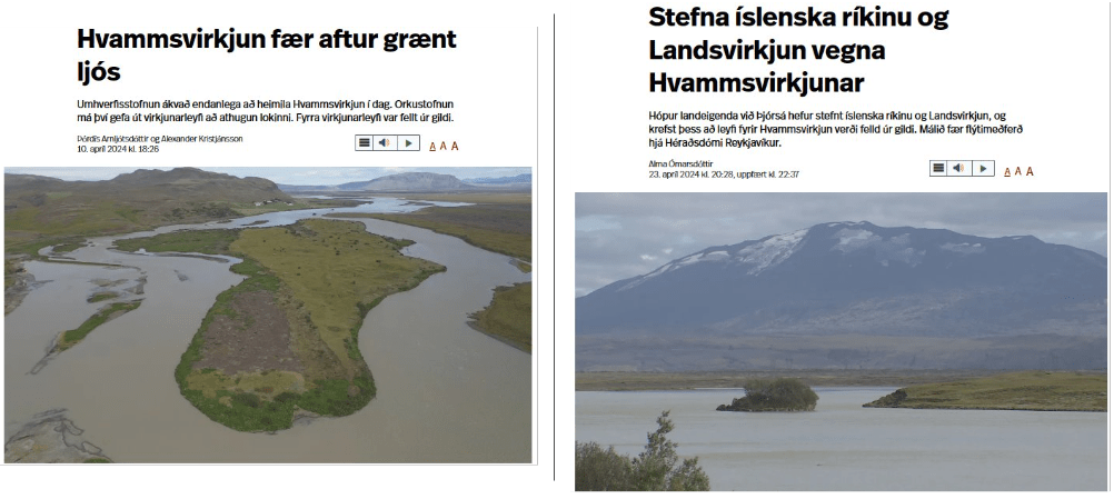 Góður virkjunarkostur sem stöðvaður var fyrir um ári síðan sést á myndum hér að ofan og við erum ekki fyrr búin að lesa fyrirsögnina vinstra megin, en við rekumst á aðra sem er til hægri!