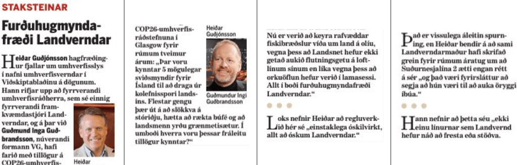 Það var skrifað um hugmyndir Landverndar í ,,Staksteinum“ Morgunblaðsins og komið víða við. Þar er sagt frá ,,umhverfisslys[um] í nafni umhverfisverndar“. Sagt er einnig frá því, að VG- ingar hafi áhyggjur að kolefnisspori landsins, sem ekki telst víst til tíðinda.