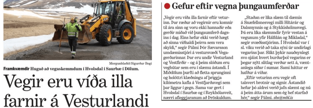 Vegir eru víða illa farnir eftir þungaflutninga sem á þeim eru stundaðir, eftir að menn komust að því, að ekki væri hægt að notast við sjóinn til þeirra hluta. Sjórinn er þeirrar náttúru að hann víkur sér undan þunganum og fer síðan aftur í sitt fyrra horf og það er víst ekki nógu gott.