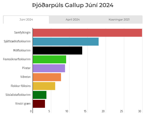 Samfylkingin mælist stærst og hvorki Vinstri græn né Sósíalistaflokkurinn myndu fá þingmann m.v. júnímælingu 2024 hjá Gallup.