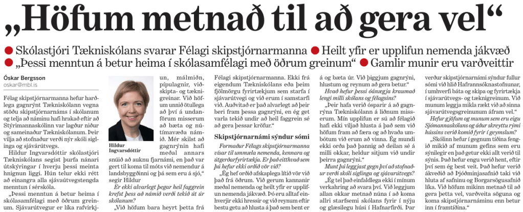 Við sjáum í undirfyrirsögn, að ,,Tækniskólinn“ hefur yfir sér skólastjóra eins og við mátti búast og það er hann (Hildur Ingvarsdóttir) sem rætt er við og hún er að svara athugasemdum Félags skipstjórnarmanna.