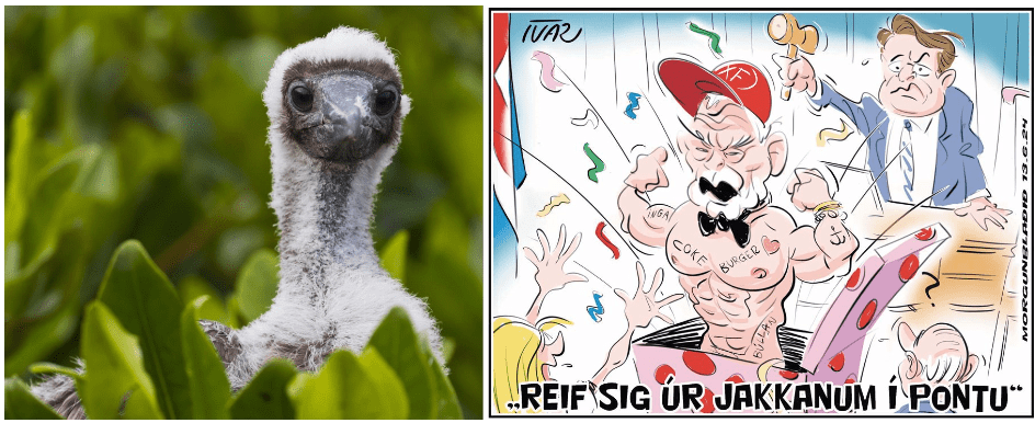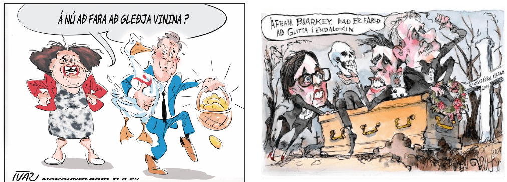 Parið á vinstri myndinni, sem ekki er par, teljum við okkur vita hver eru, annað er kona sem þekkt er að því að geta haft hátt og láta ekki sitt eftir liggja í þrasi á þingi og það er sem hún hafi þarna komist í feitt, því núverandi forsætisráðherra, þar áður utanríkisráðherra og fjármálaráðherra og þar áður eitt og annað, er að laumast burt með gullgæsina og eggin sem hún er búin að verpa.