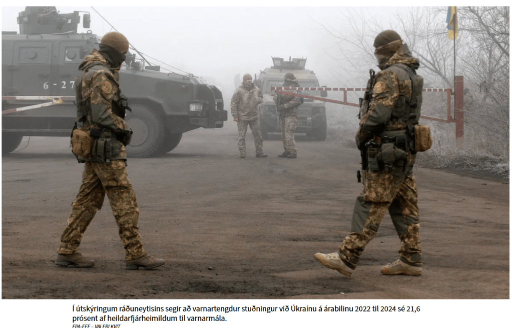 ,,Í útskýringum ráðuneytisins segir að varnartengdur stuðningur við Úkraínu á árabilinu 2022 til 2024 sé 21,6 prósent af heildarfjárheimildum til varnarmála.„