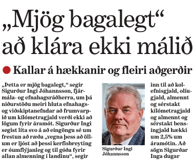 ,,Sigurður Ingi segir að í þessari frestun felist líka áskorun um að stoppa í gat sem til verður og kalli á hækkanir frá og með næstu áramótum, meðal annars á bensín- og dísilgjöldum sem hefðu ellegar lækkað um 80 til 90 krónur frá dælu 1. janúar þegar gjöldin áttu að falla niður og kílómetragjaldið að koma í staðinn.“