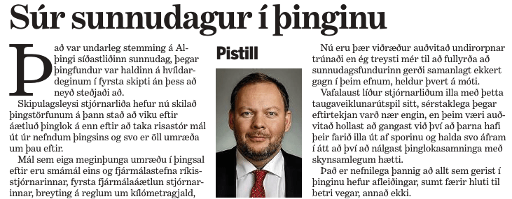 En allt er það vont og verra en verst að mati Miðflokksmanns sem er búinn að tala yfir sig líkt og félagar hans, um það sem hann telur sig hafa betra vit á en þeir sem hann talar til, en hvort sú skoðun og það álit, nær út fyrir flokksherbergið er frekar ólíklegt.