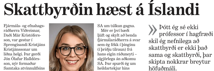 ,,Skattbyrði er ekki sama og skattbyrði“ segir maður nokkur sem ekki er prófessor í hagfræði, því hann hefur fundið ,,nokkrar breytur“ sem skipta ,,höfuðmáli“ og höfuðmál er ekki sama og höfuðmál eins og allir vita sem átt hafa höfuðföt!