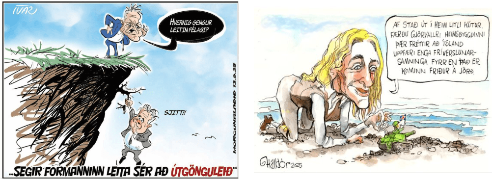 Halldór teiknar fyrir Vísi og Ívar Morgunblaðið og við gerum ekki upp á milli þeirra en njótum þess að virða myndirnar fyrir okkur og undrumst hve mikið er hægt að fanga í eina litla mynd.