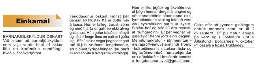 Við byrjum á einkamálaauglýsingum úr Bændablaðinu, þar sem óskað er eftir barnafjölskyldum, leitað að tengdasyni af mikilli nauðsyn og að lokum ,,óskað eftir að kynnast glaðlegum náttúruunnanda“.